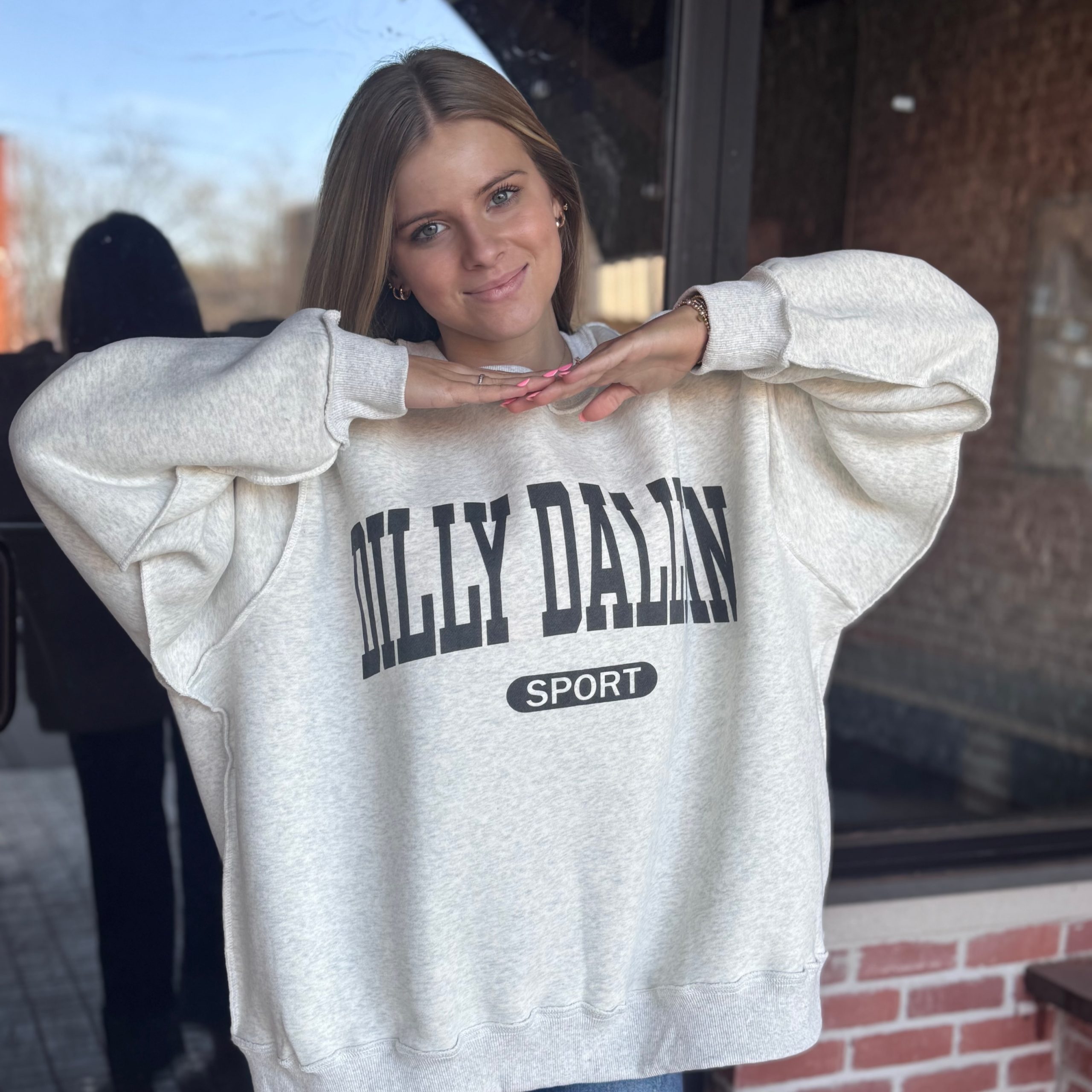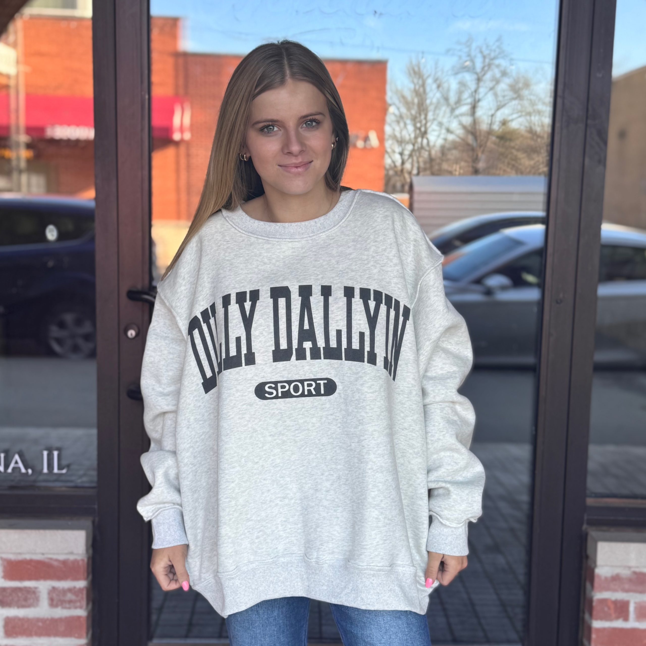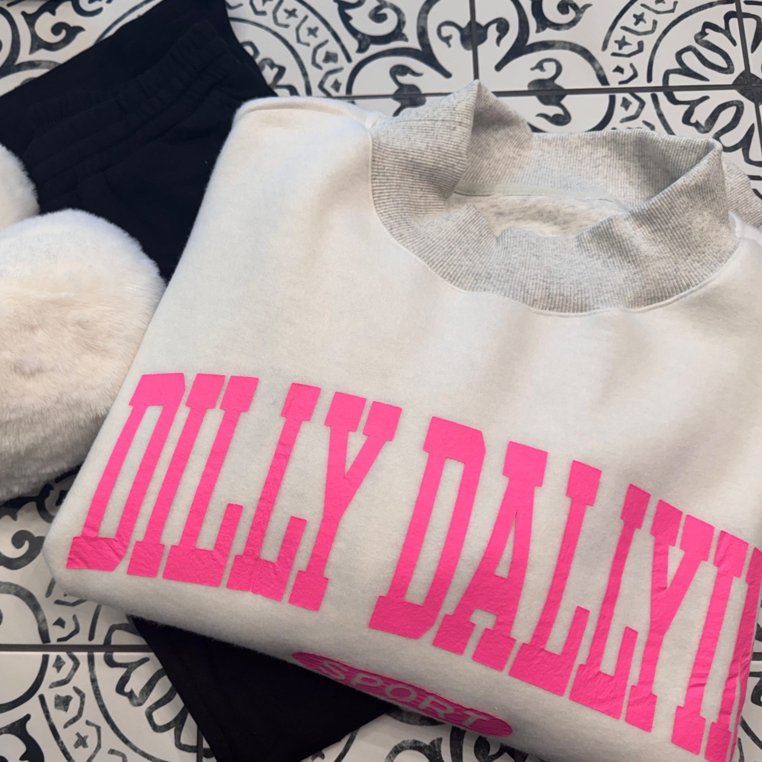 - The picture shows dilly dallyin in pink on a mock neck but the product is a crew neck
