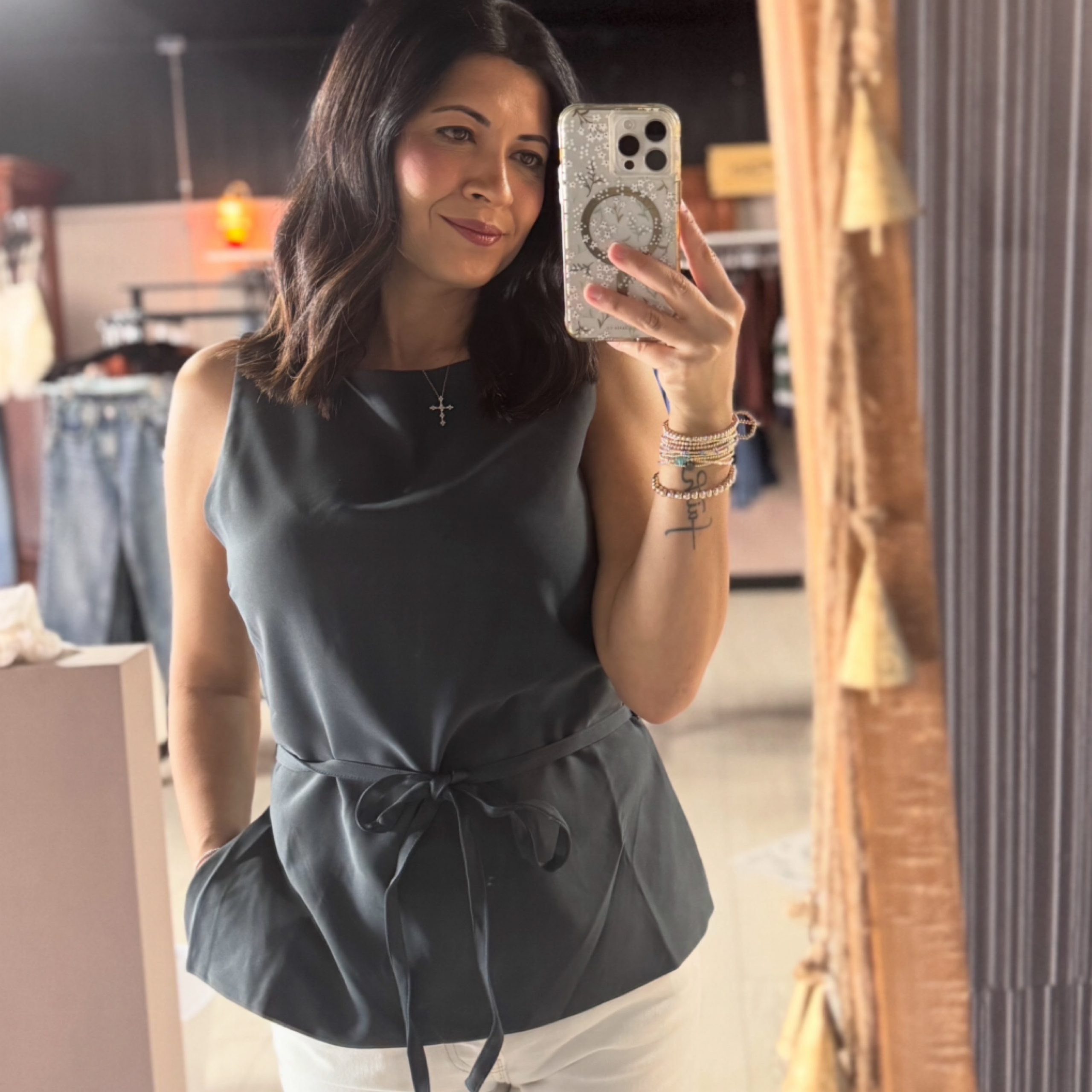 Color slate Boat neck Split sleeveless top Tie front 95% polyester 5% spandex
