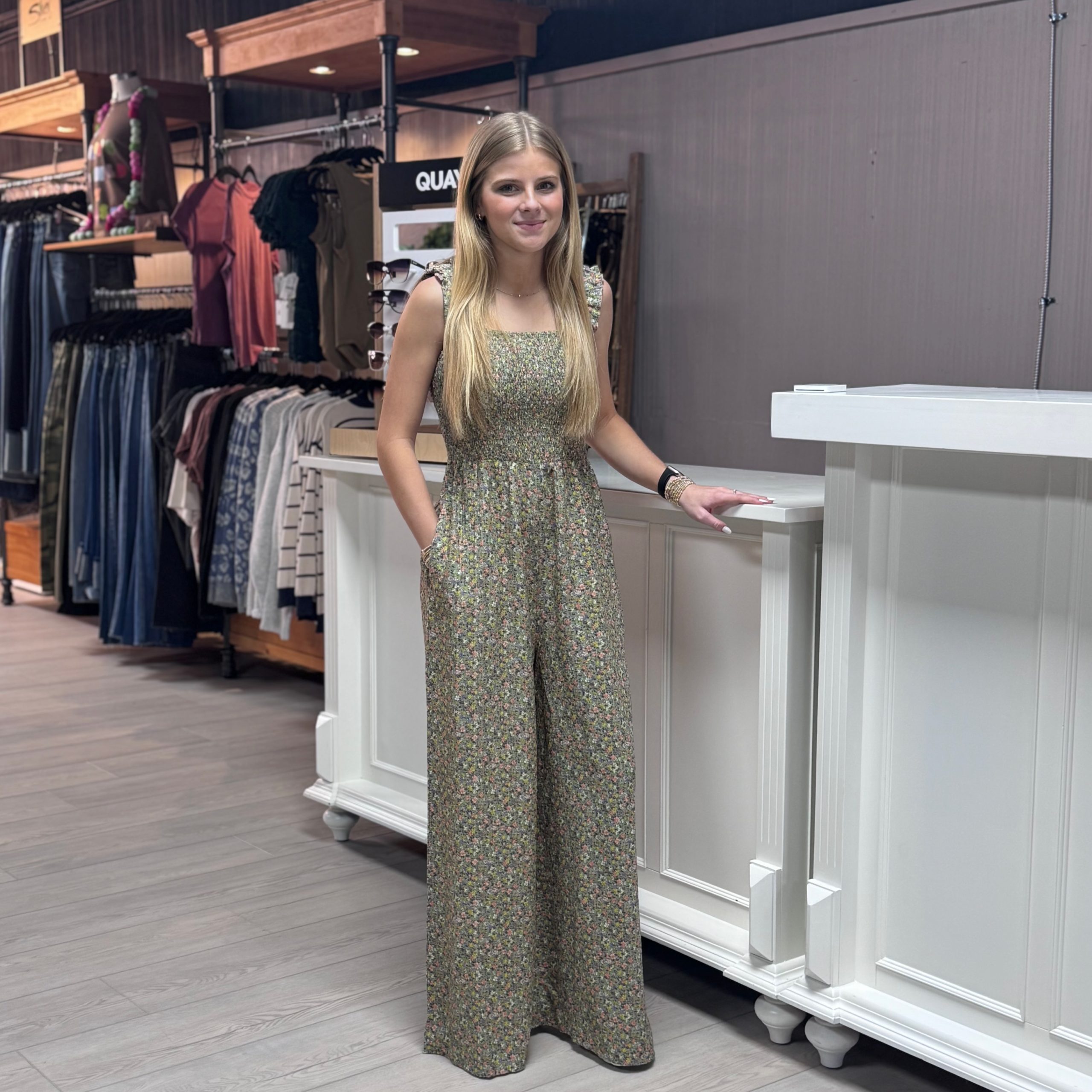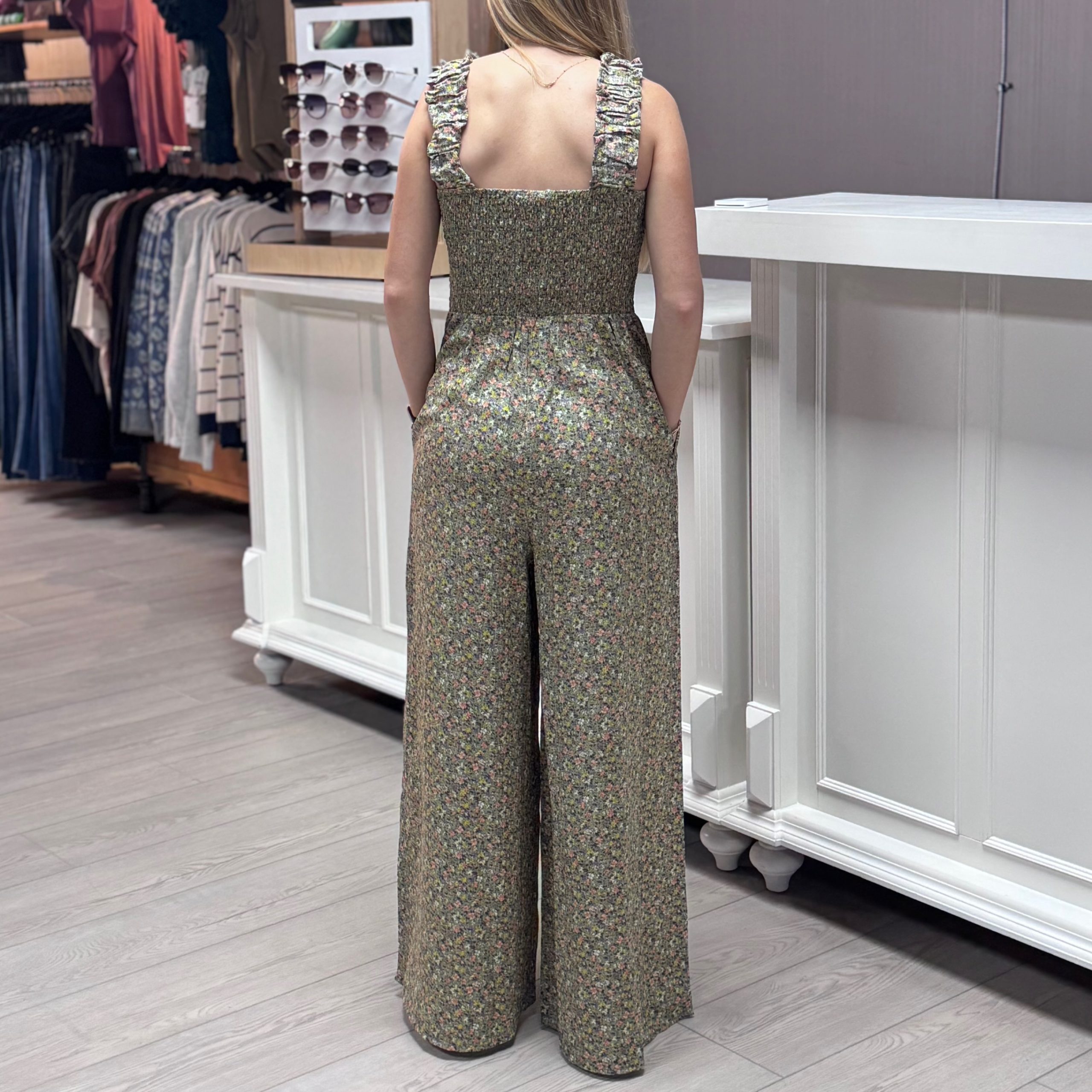 Smocked top and straps Side pockets Wide leg Floral print Color- sage